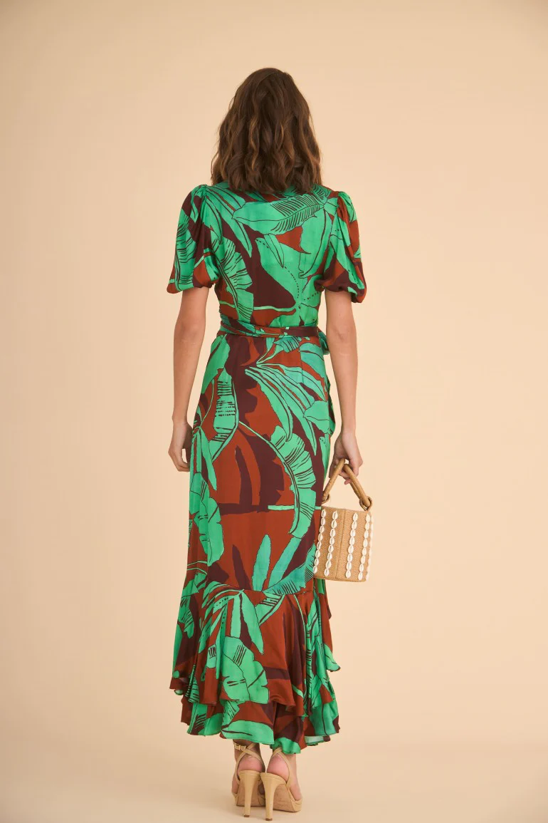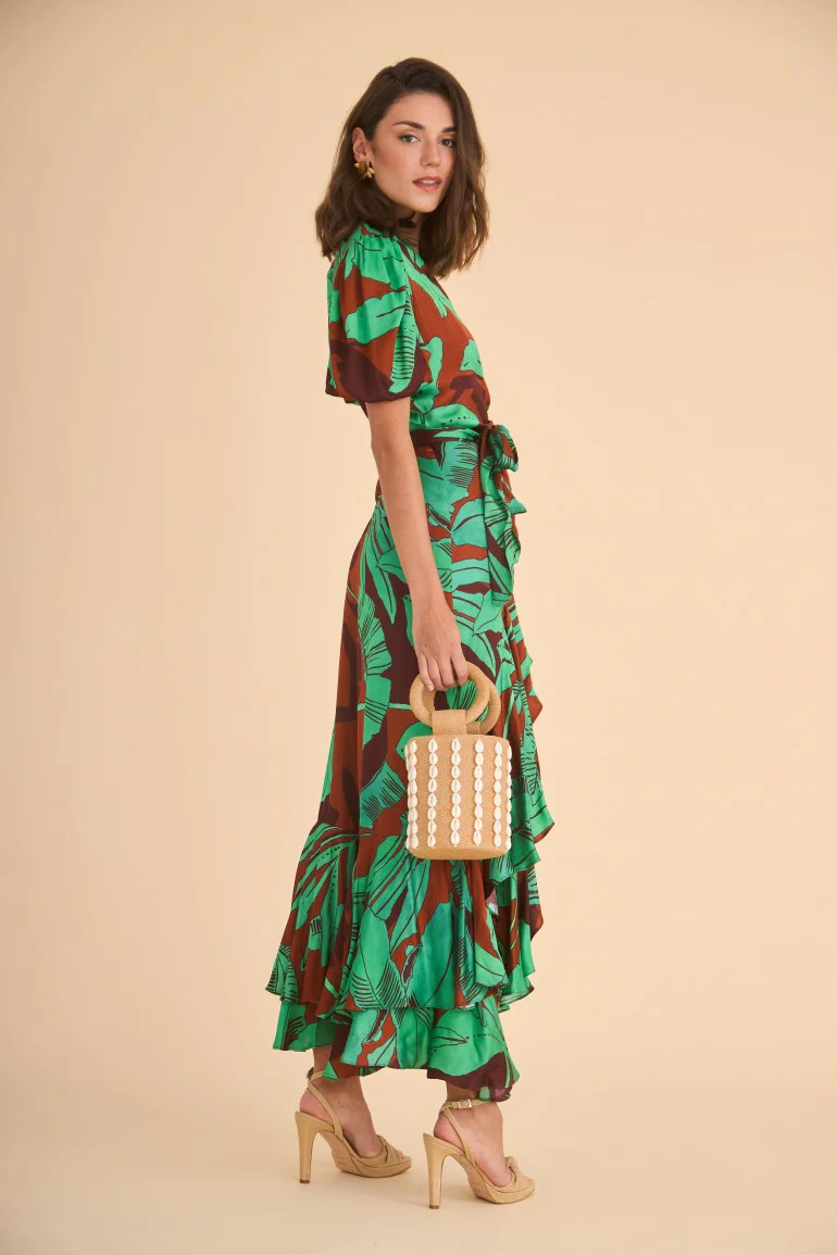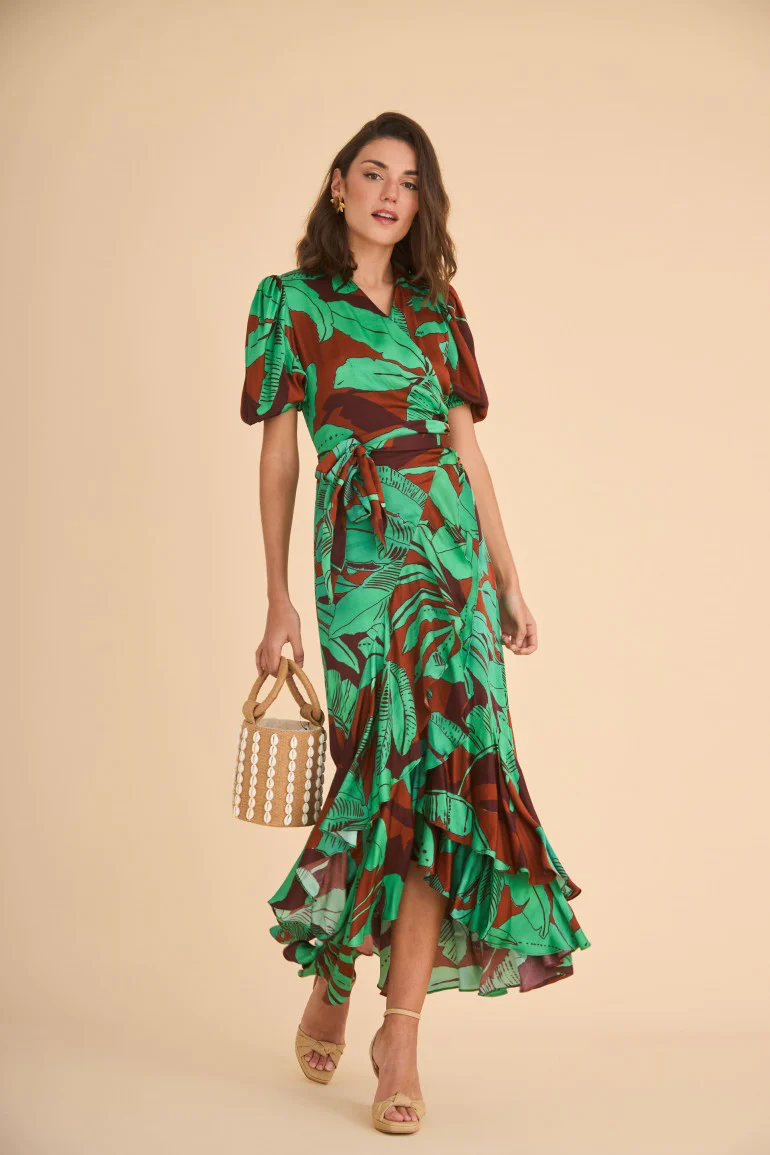 Vestido de fiesta confeccionado en satén estampado de palmeras. Escote en pico cruzado y manga corta abullonada con elástico. Falda estilo pareo con doble volante.