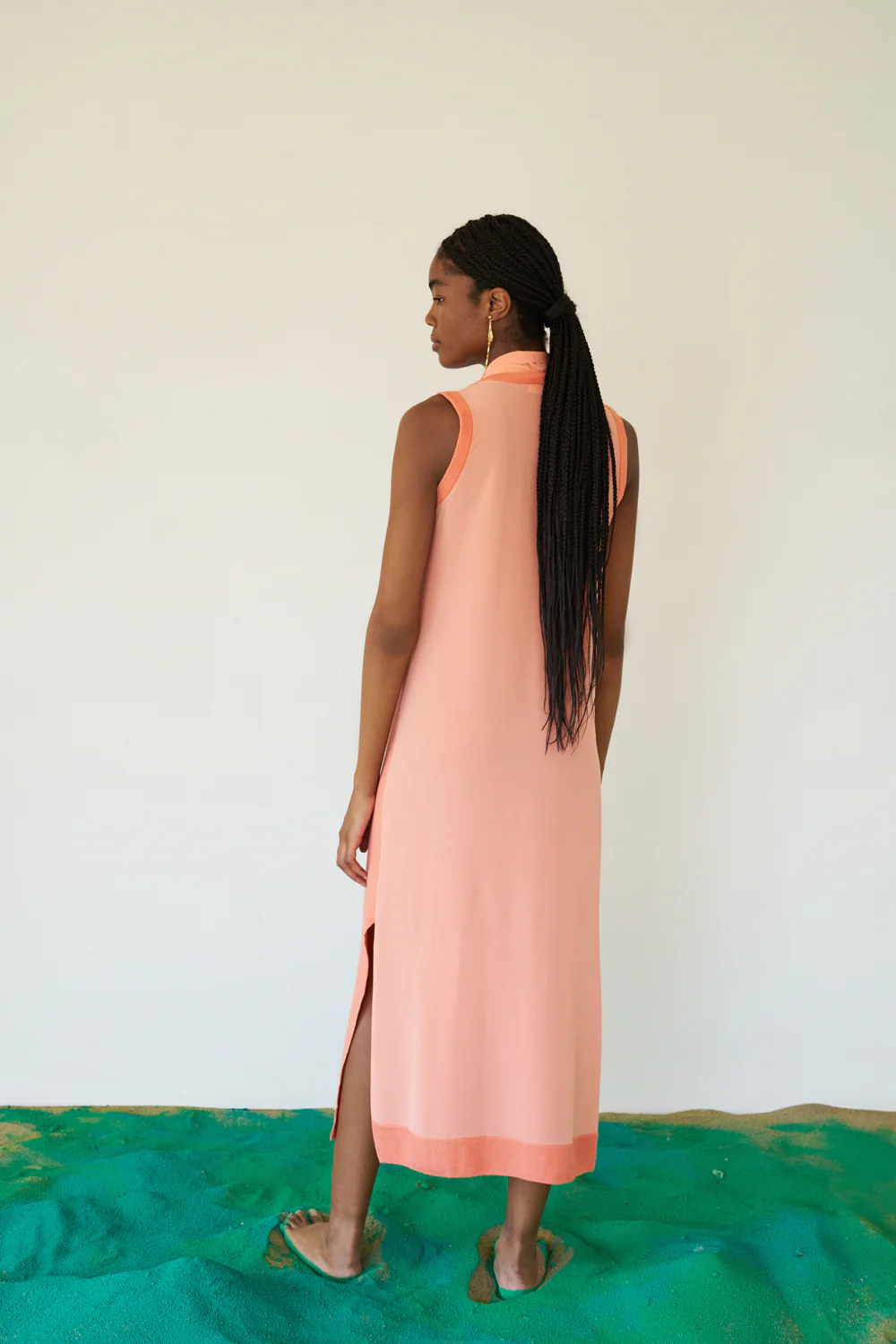 Vestido de manga sisa color coral con lazo para anudar en el cuello o cintura, por delante es un punto de lino espalda tejido seda. Con escote en V. Marca Sita Murt. Es un imprescindible para la temporada primavera-verano