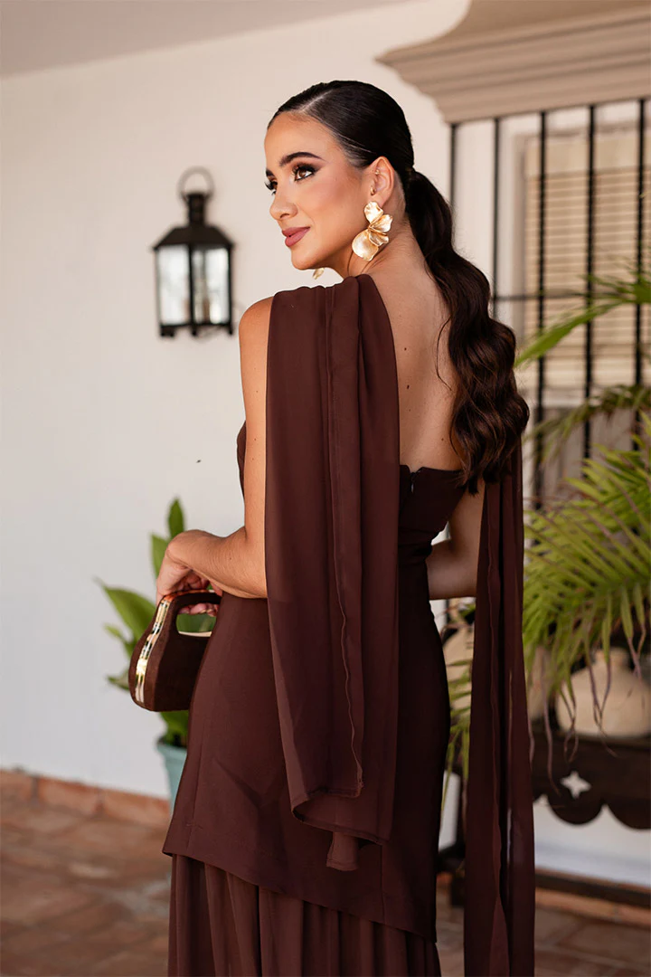 Este vestido es creado por nosotros único y exclusivo en marrón. Incluye la capa con el vestido.