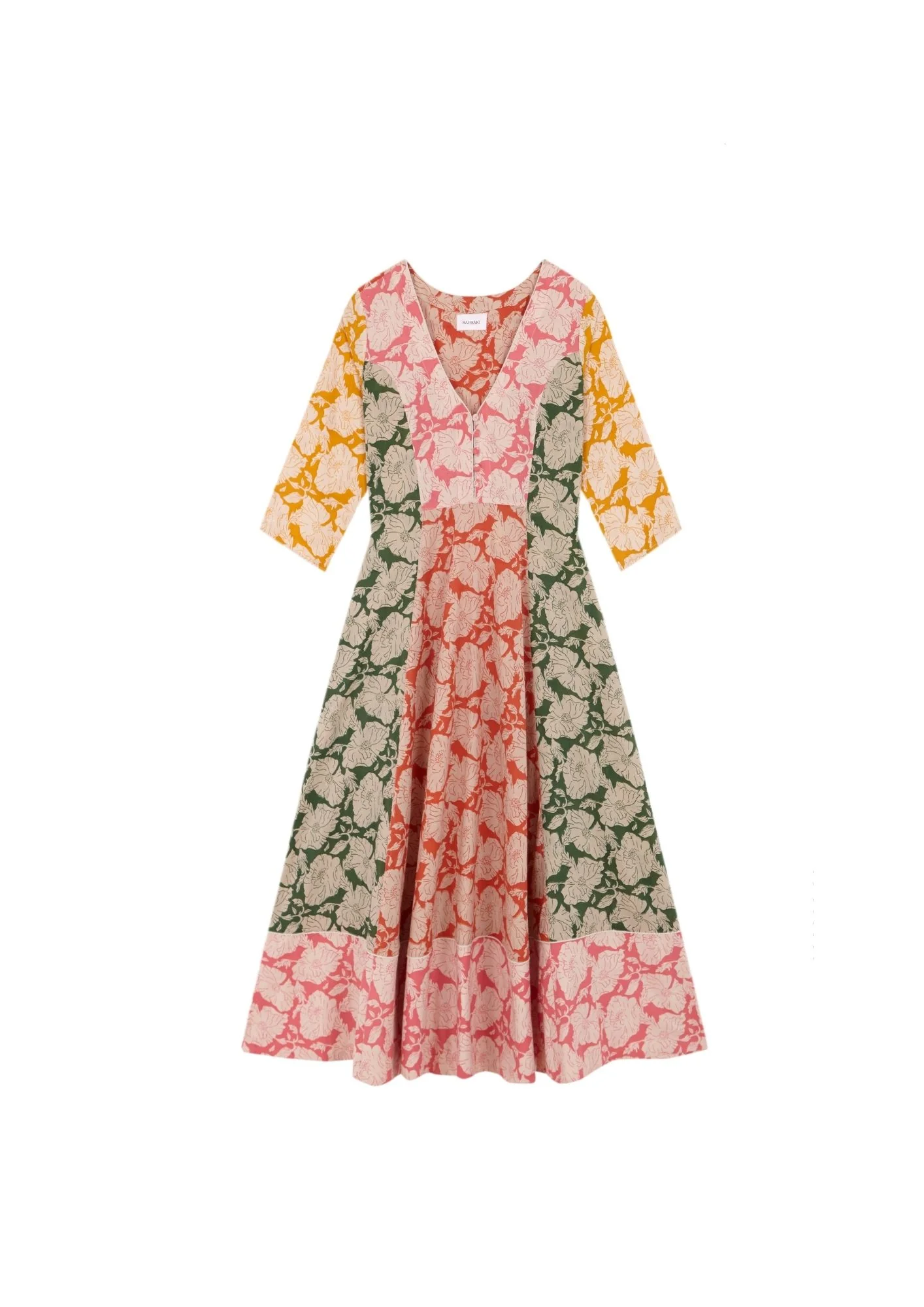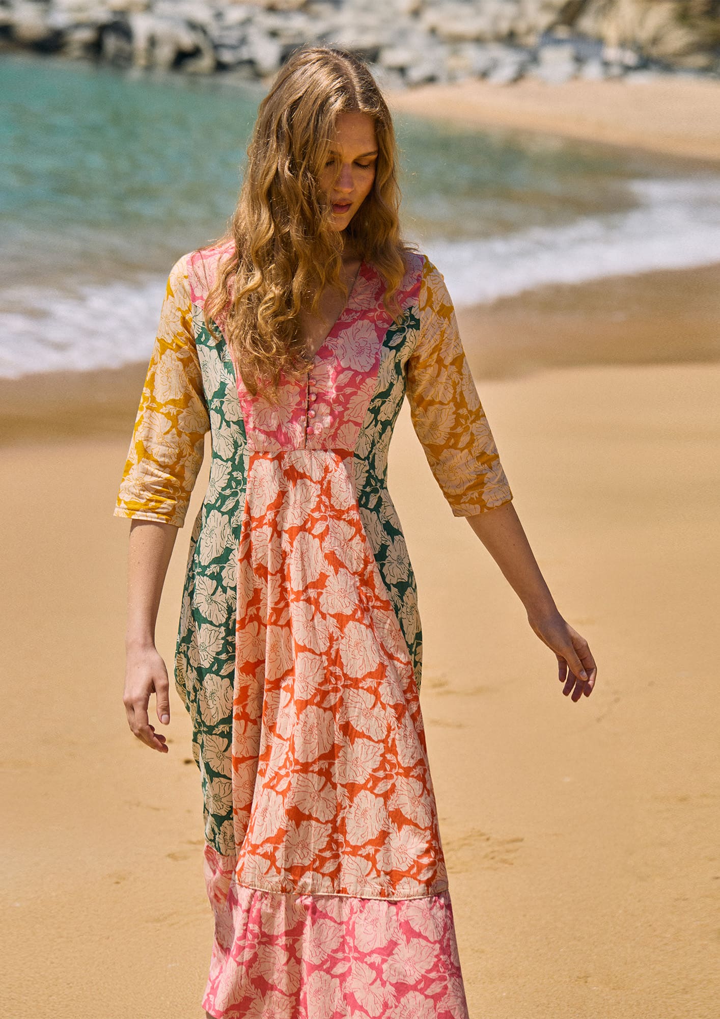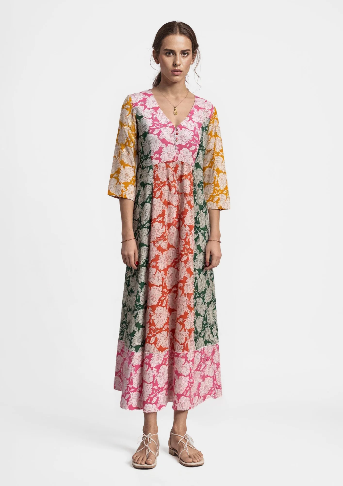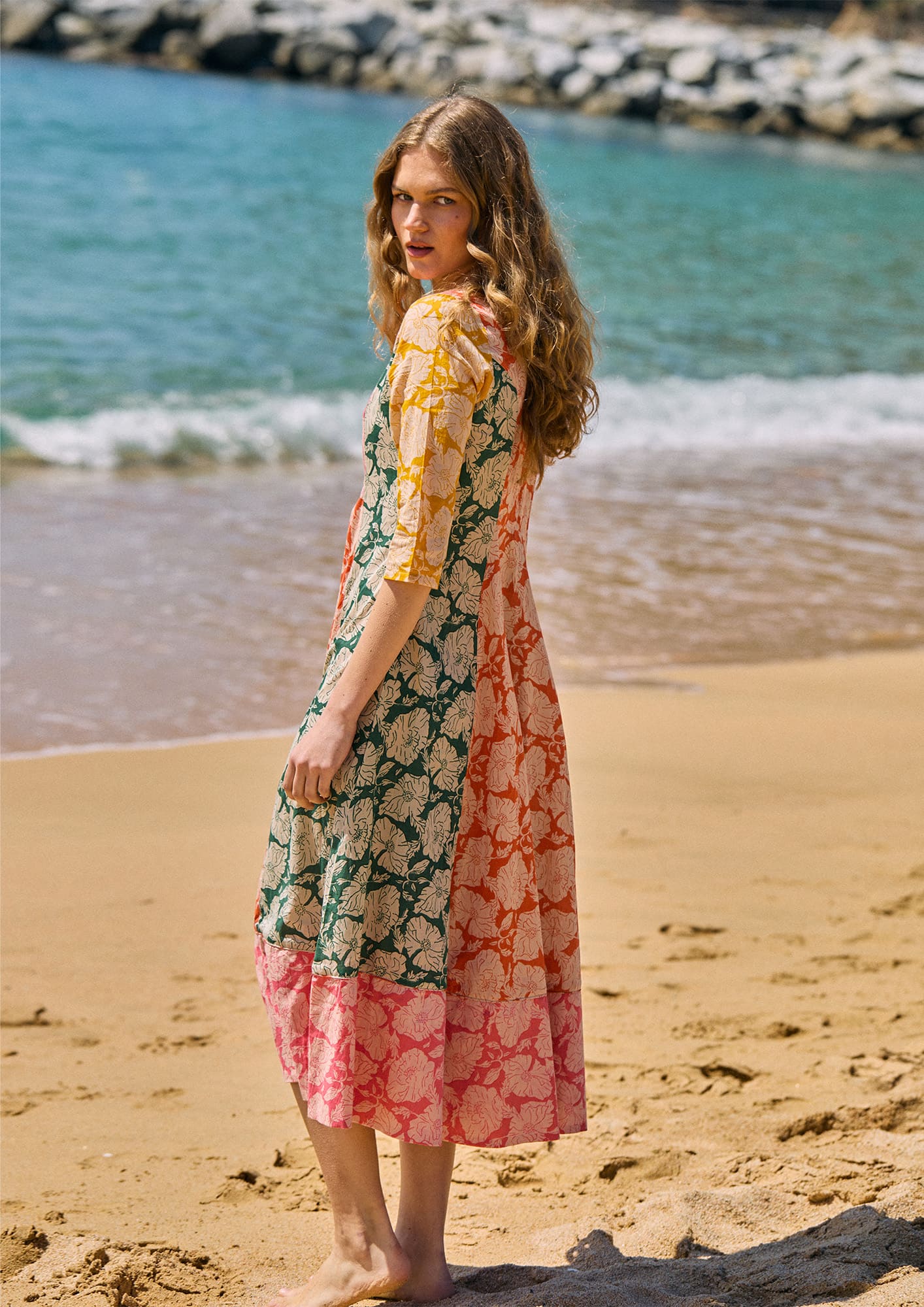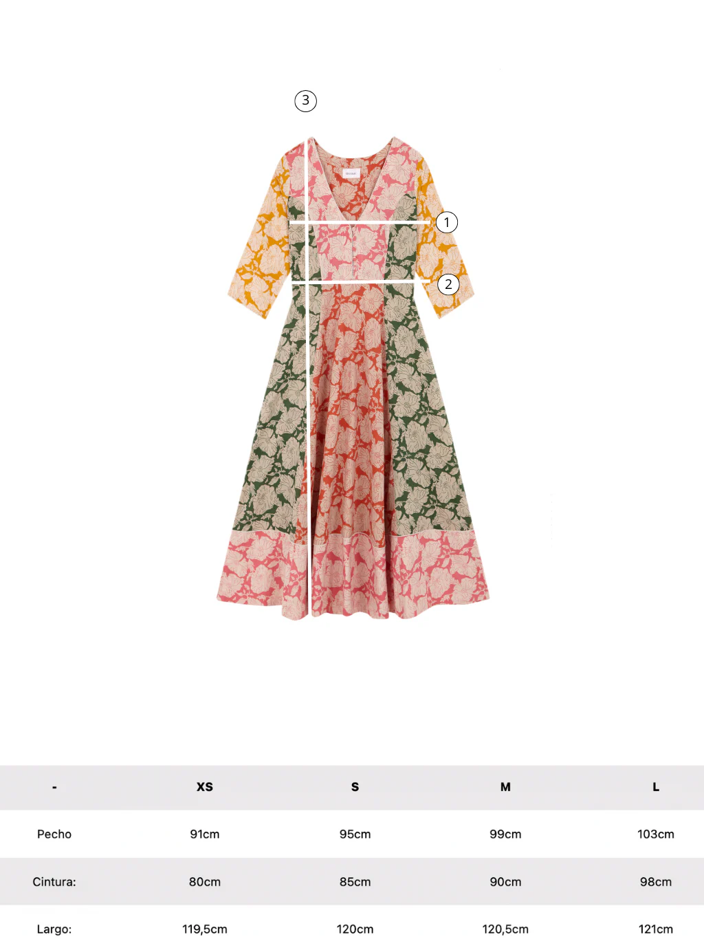 Este vestido ha sido estampado a mano con la técnica tradicional de estampado en bloque, lo que hace que cada prenda sea única.