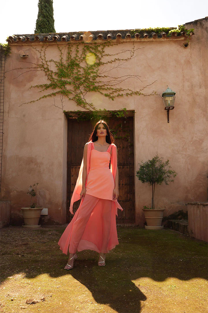 Esta espectacular prenda se caracteriza por su falda asimétrica acampanada con un toque muy especial, su acabado en gasa vaporosa con abertura lateral. Destacamos también su escote cuadrado con tirantes gruesos y solapa en el pecho dándole originalidad.