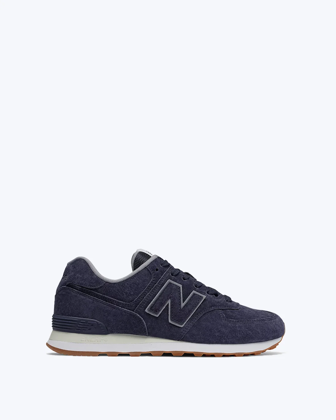 Zapatillas azules de la marca New Balance modelo 574, con empeine de ante de cerdo, de diseño clásico y resistente.