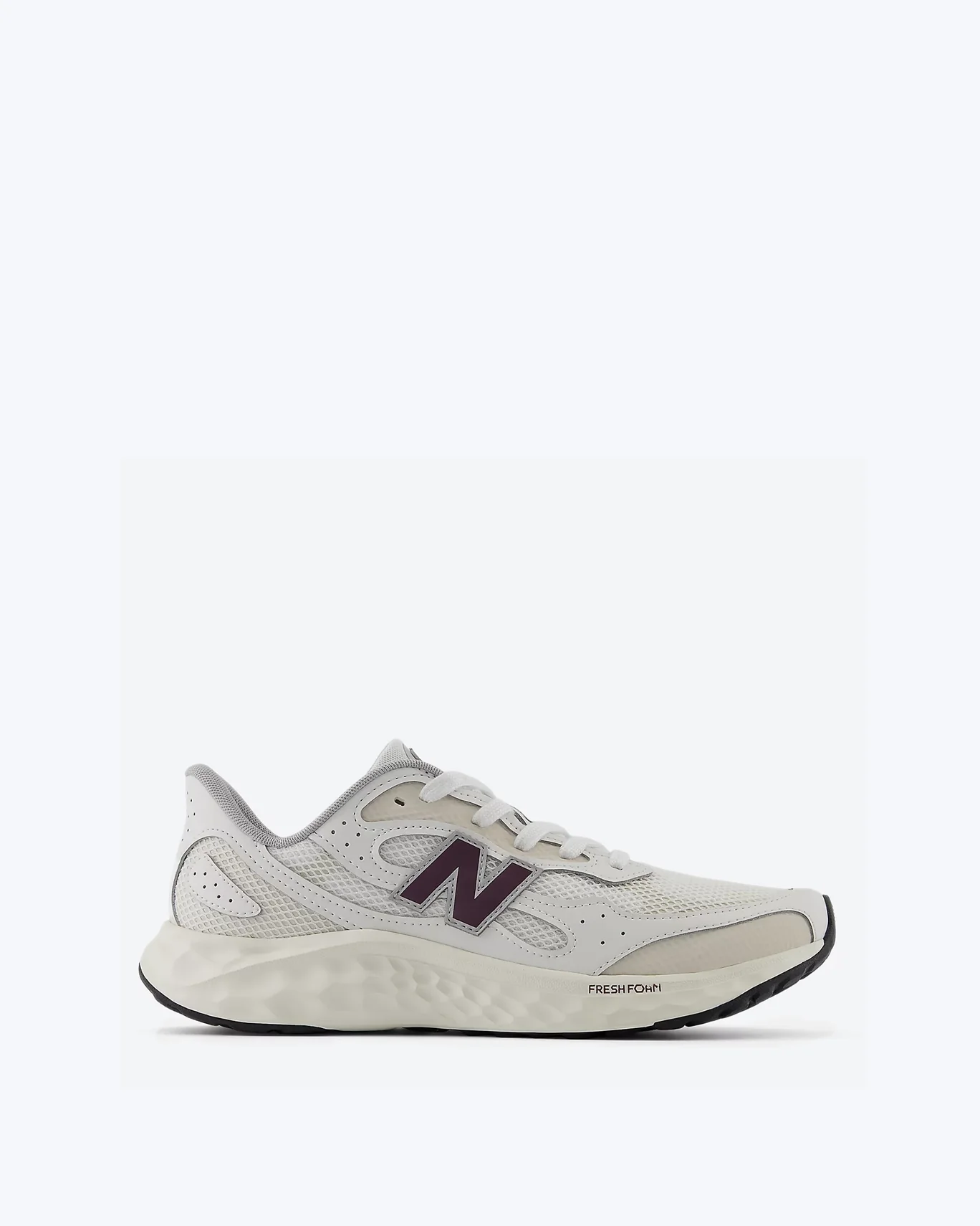 Zapatillas New Balance modelo Fresh Foam , de color blanco, con detalles en color beige y berenjena.