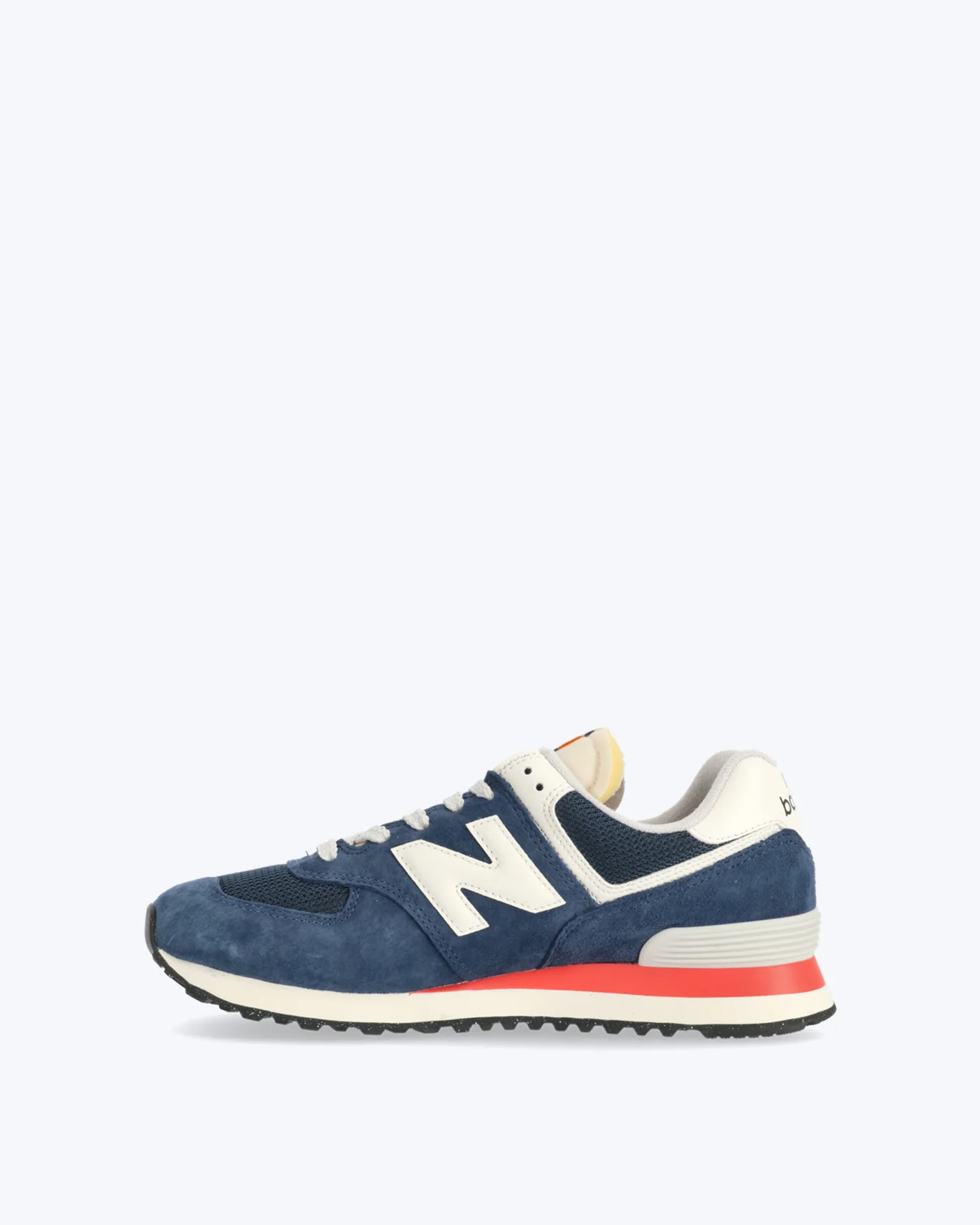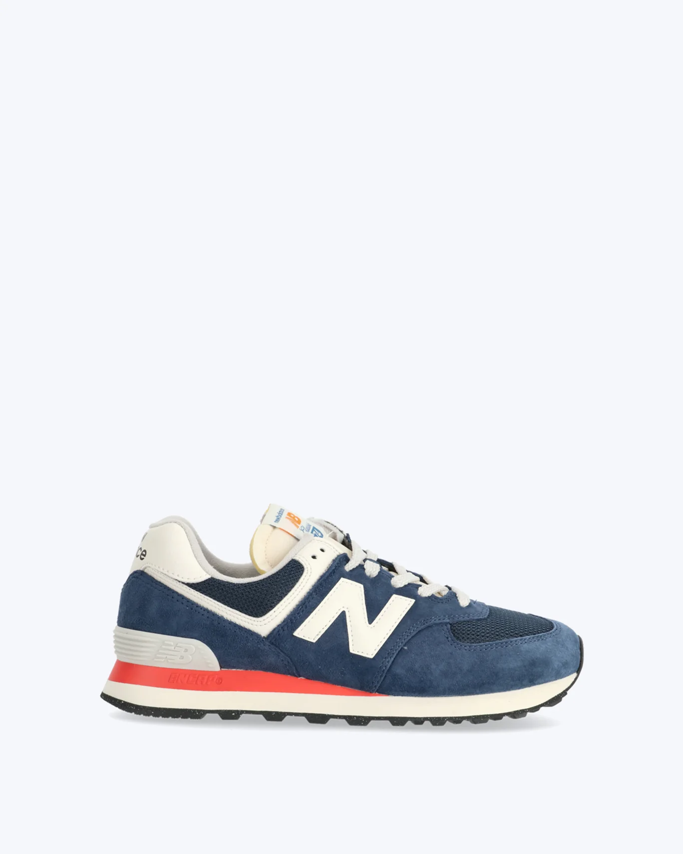 Zapatillas New Balance modelo 574, de ante en color azul, con detalles en color rosa y blancos.