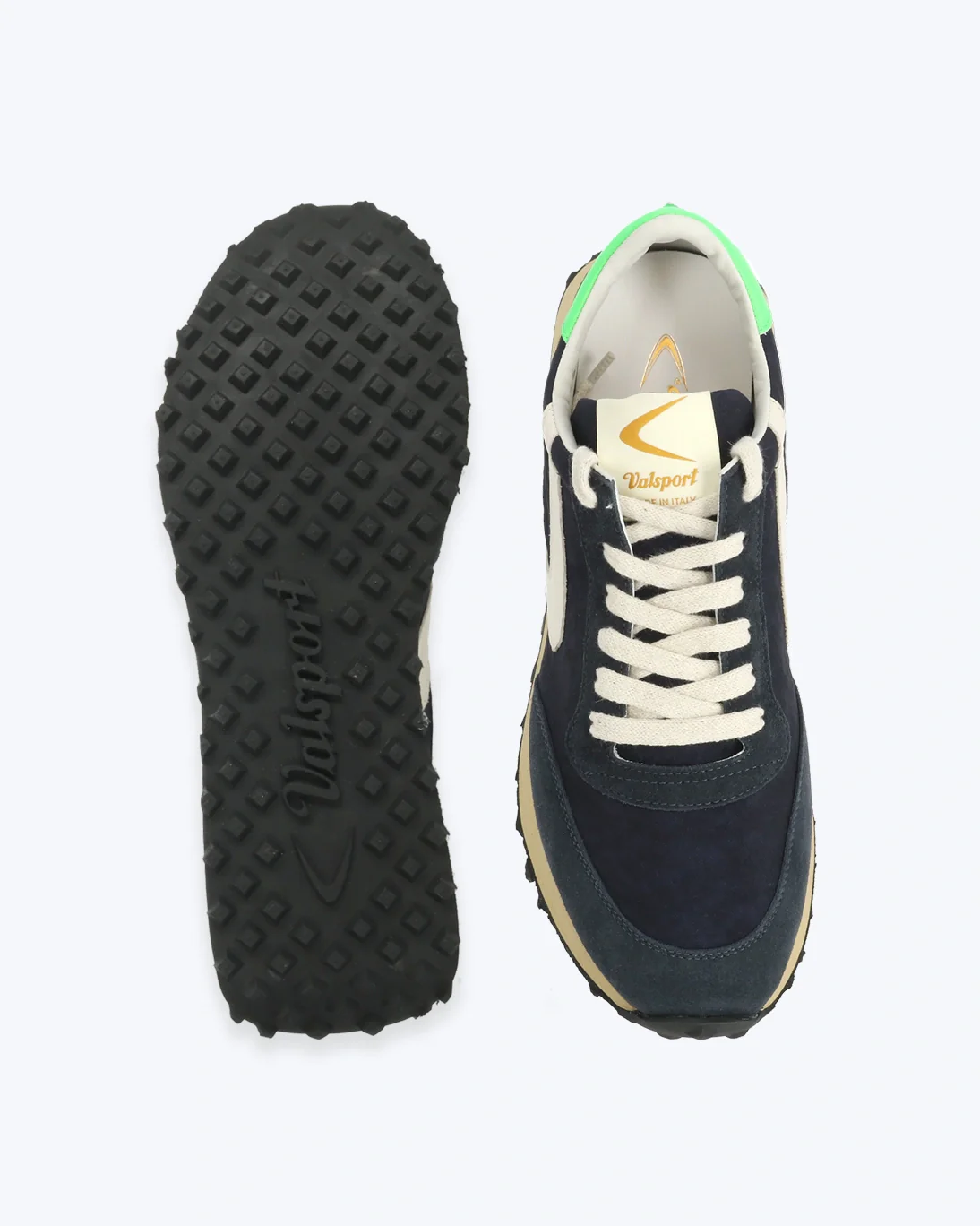 Parte superior en nailon ripstop combinado con ante. Boomerang en cuero napa. Suela de goma diseñada por Valsport con acabado en negro. Forro de cuero y cordones de algodón