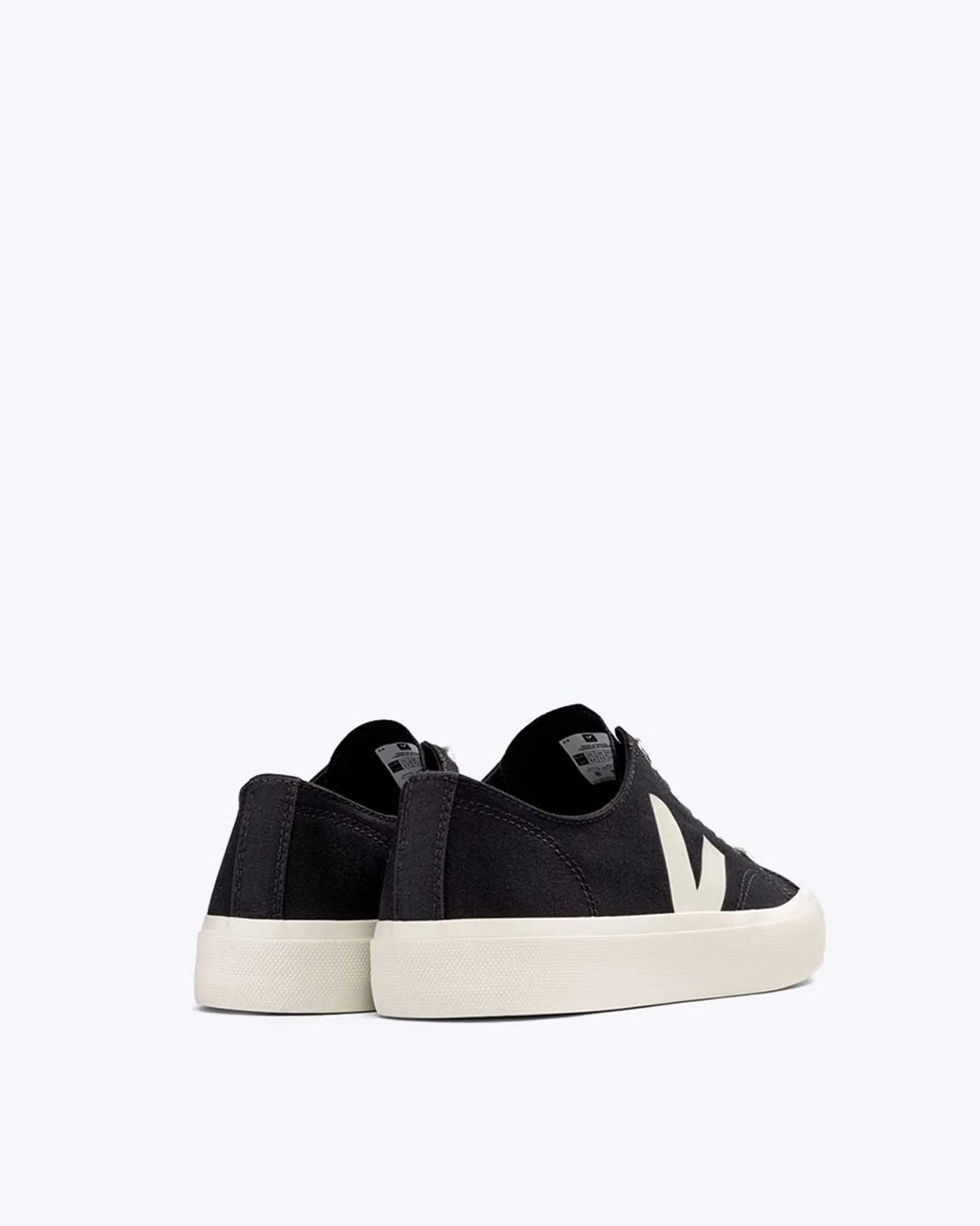 Zapatillas de la marca Veja modelo Wata II, en color negro, con detalles en blanco. La puntera es blanca y la suela de caucho.