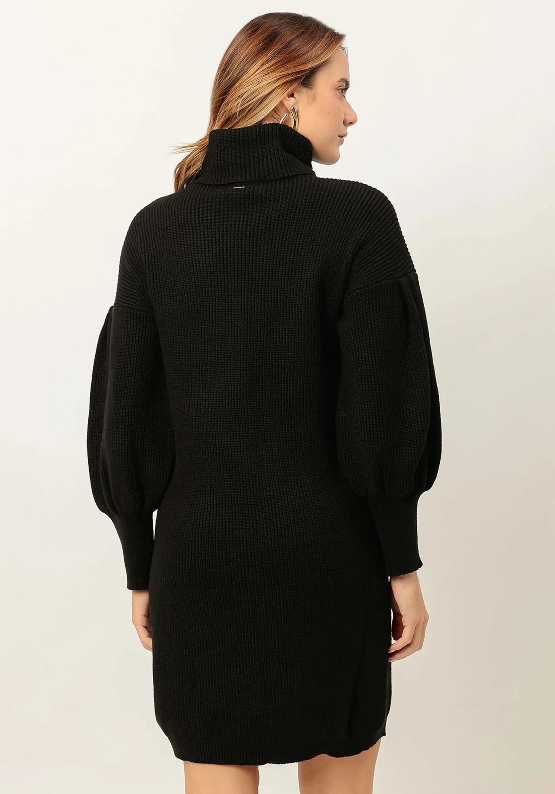 VESTIDO NEGRO CORTO DE PUNTO, CUELLO ALTO Y MANGAS ABULLONADAS