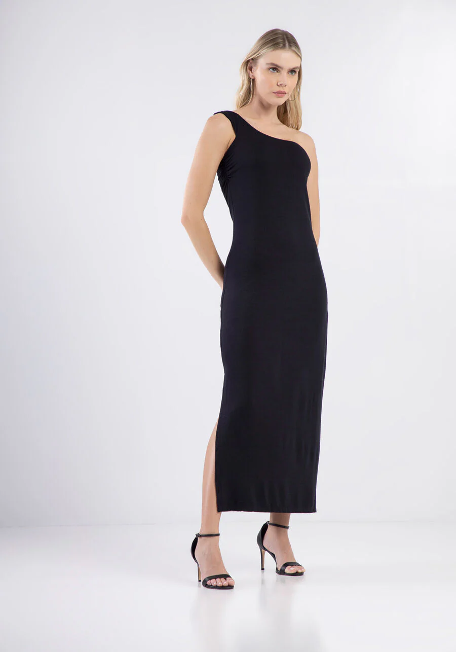 VESTIDO NEGRO MIDI UN SOLO HOMBRO