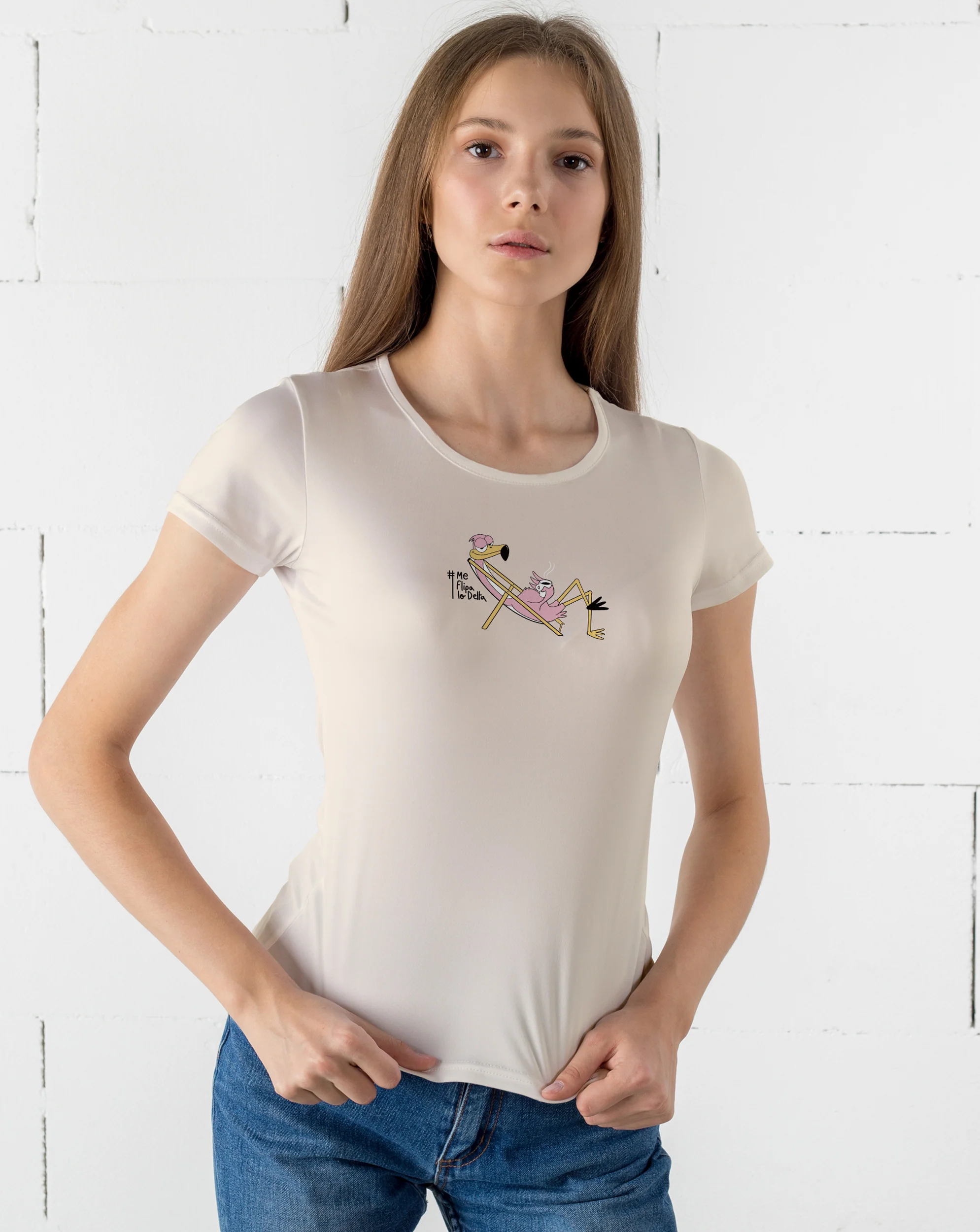 Camiseta manga corta entallada para mujer en blanco vintage cuello redondo y estampado flamenco de relax