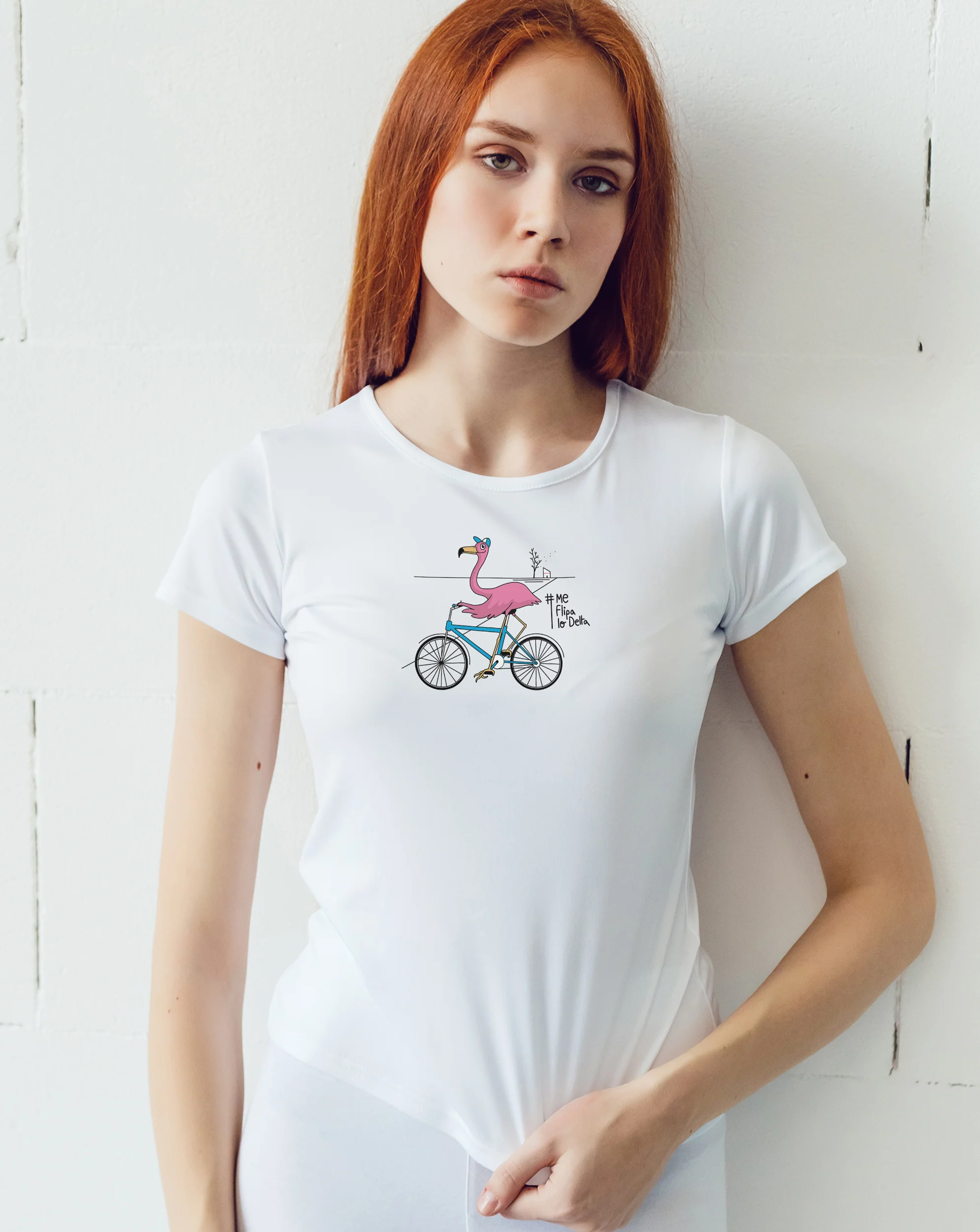 Camiseta manga corta entallada para mujer en blanco cuello redondo y estampado flamenco en bicicleta