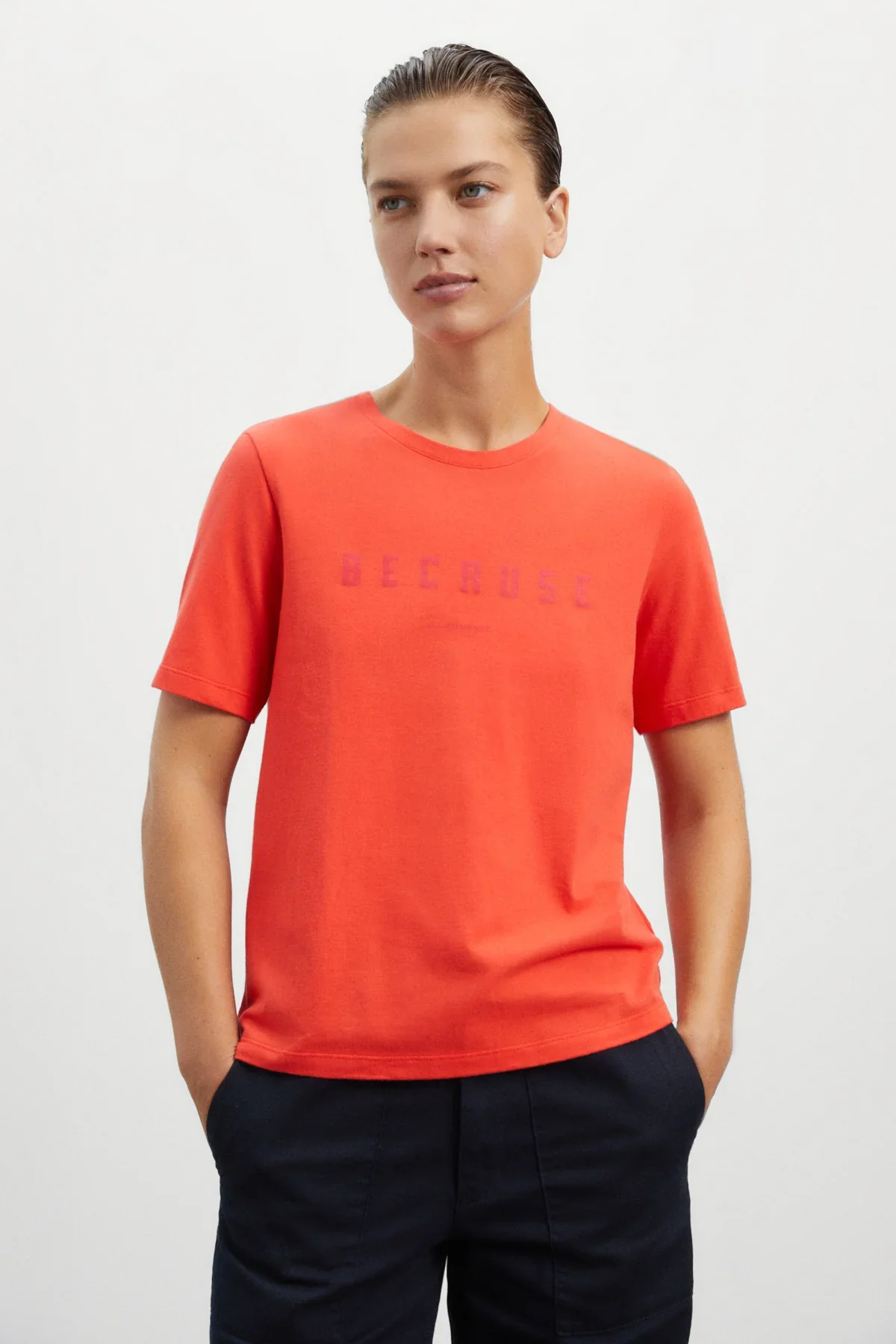 Camiseta manga corta unisex en color rojo teja y estampado de ave haciendo fotos