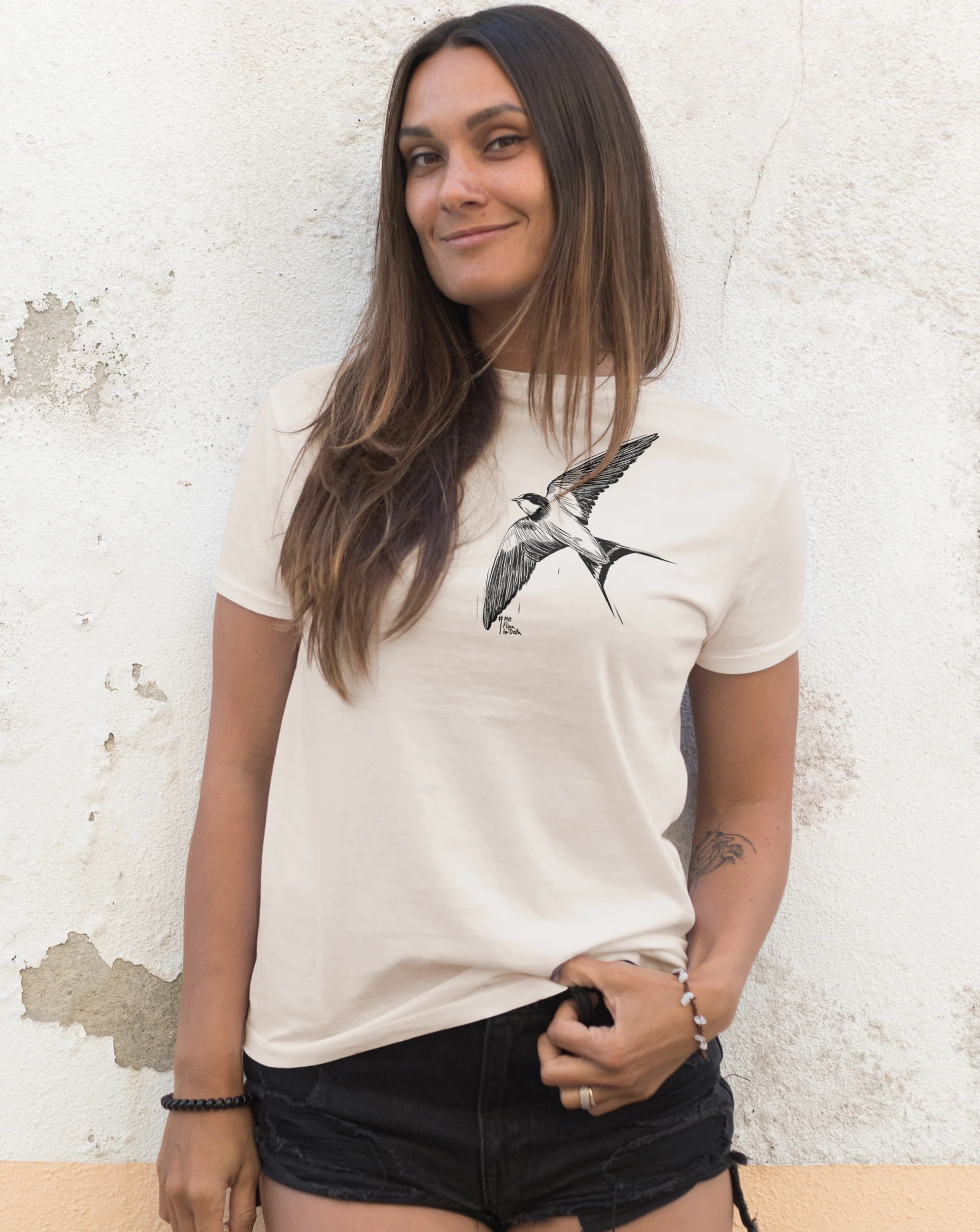 Camiseta manga corta entallada para mujer en blanco vintage cuello redondo y estampado golondrina