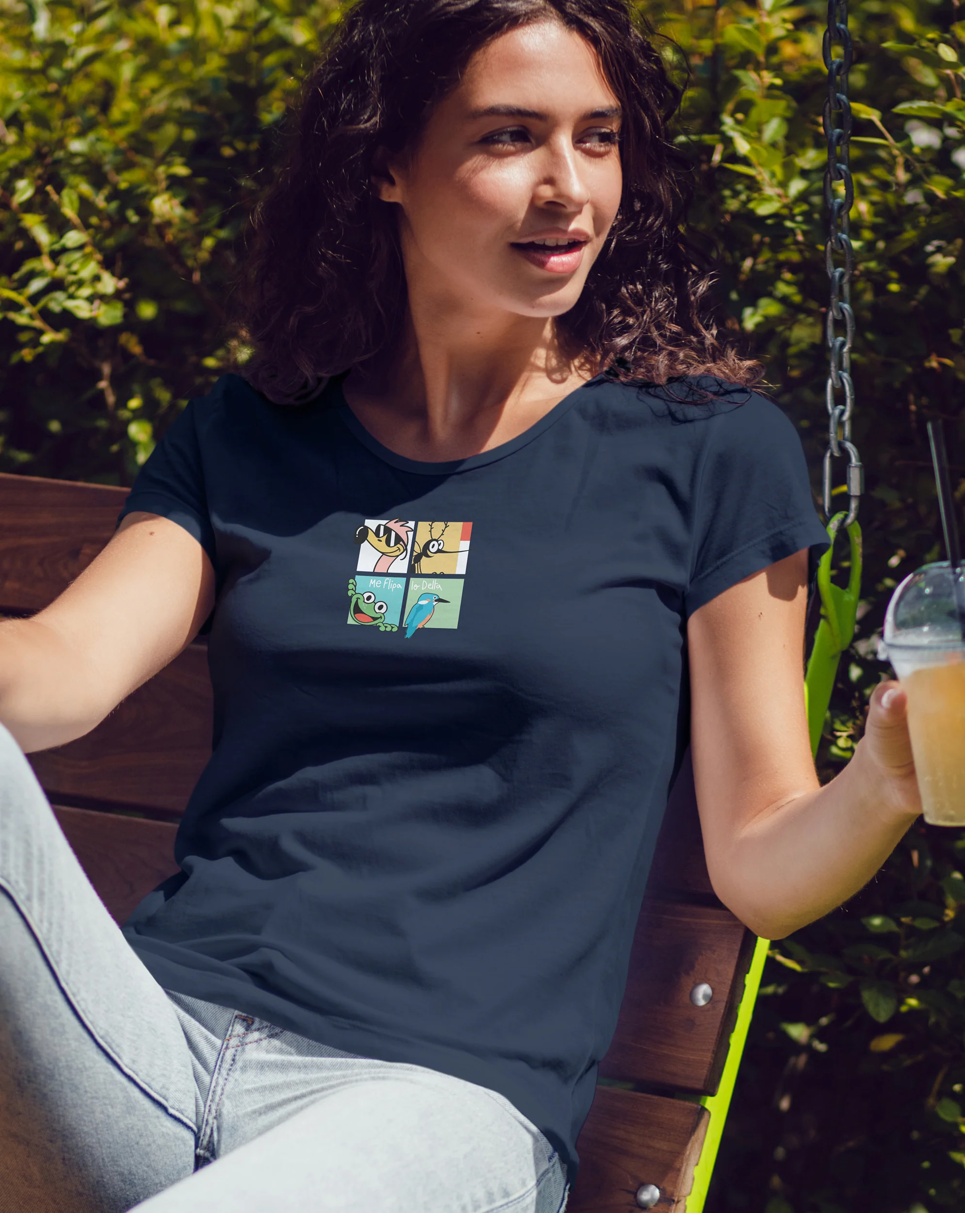 Camiseta manga corta entallada para mujer en azul marino cuello redondo y estampado rana tanga