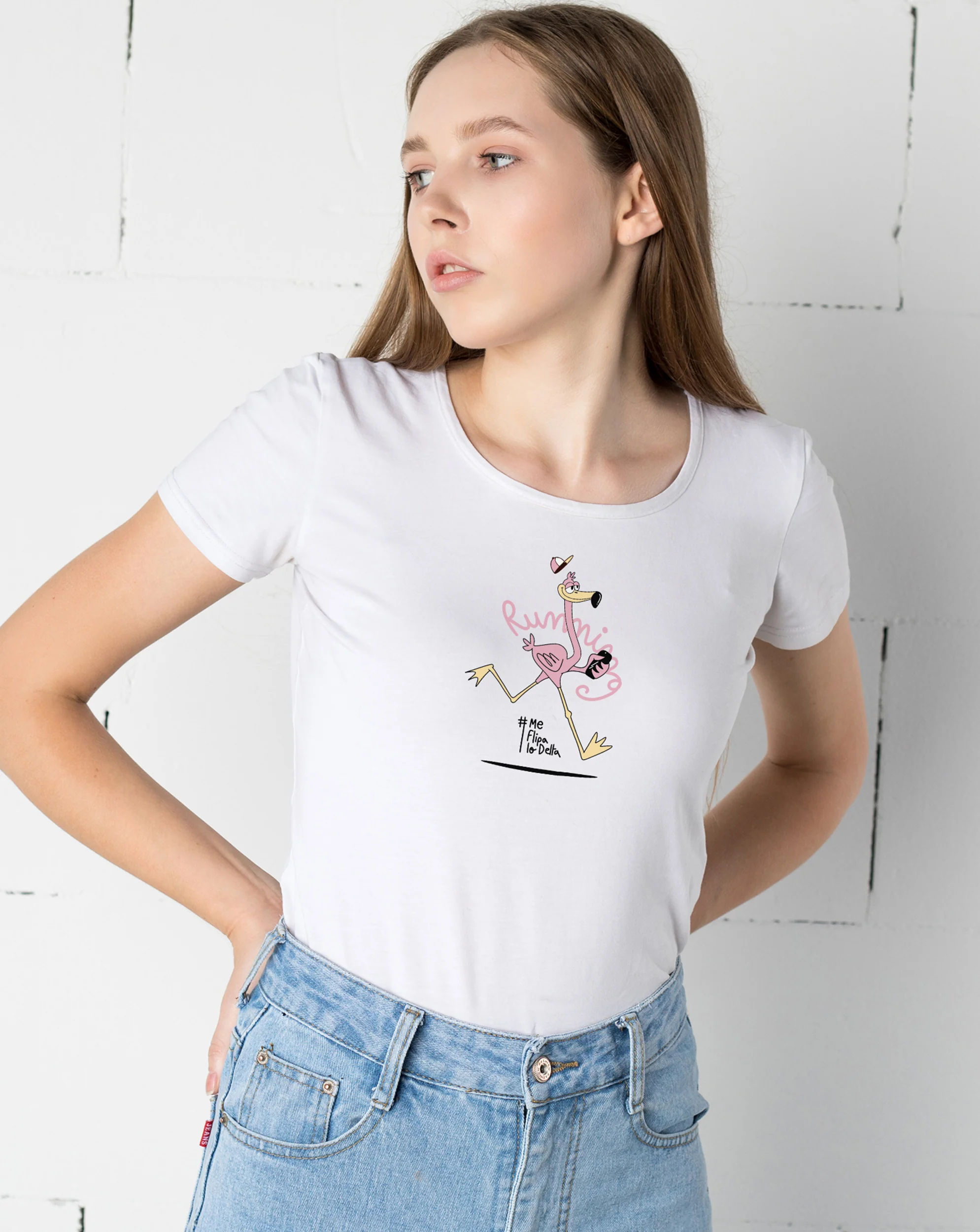 Camiseta manga corta entallada para mujer en blanco cuello redondo y estampado flamenco running